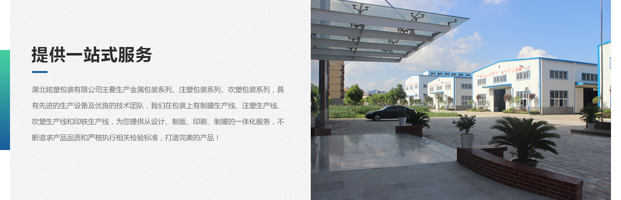 湖北銘塑包裝有限公司一家集研發(fā)、生產、銷售于一體的較優(yōu)秀民營企業(yè),技術力量雄厚,產品質量可靠。位于交通暢順,百業(yè)興旺、經濟富裕、政策開放的孝感開發(fā)區域。我們企業(yè)的營銷戰(zhàn)略是以建筑為土壤,以產品為種子,以質量為肥料,讓綠色鋪滿全球。憑借多年來的行業(yè)經驗,公司不斷進行創(chuàng)新和研發(fā),為市場提供更廣泛的產品應用領域和更好環(huán)保節(jié)能產品,為國家能源環(huán)保戰(zhàn)略和可持續(xù)發(fā)展戰(zhàn)略作出應有的貢獻。 湖北銘塑包裝有限公司主要生產金屬包裝系列、注塑包裝系列、吹塑包裝系列,具有先進的生產設備及優(yōu)良的技術團隊,我們在包裝上有制罐生產線、注塑生產線、吹塑生產線和印鐵生產線,為您提供從設計、制版、印刷、制罐的一體化服務,不斷追求產品品質和嚴格執(zhí)行相關檢驗標準,打造更好的產品!